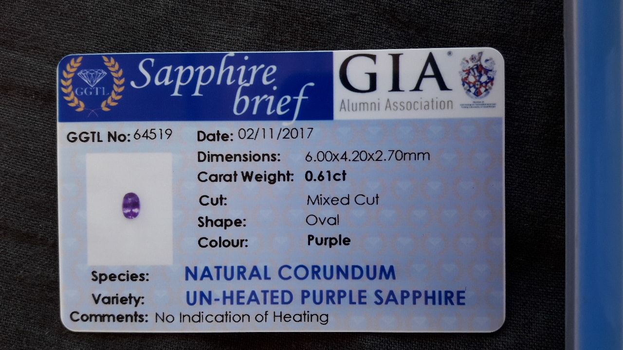 | GEMSTONE APPRAISAL / EVALUATION: | The fair market value appraisal for this purple sapphire, taking into account its certified origin, premium handcrafted oval cut, strong saturation, and excellent clarity, is estimated to be in the range of USD 500 to USD 700. The combination of features, including its unheated status and desirable coloration, adds significant value, making it a noteworthy gemstone in the market. This Sri Lankan Ceylon sapphire, with its 0.61 carat size and vibrant reddish-purple color, may not be the best investment for the future due to its smaller carat weight, which typically limits appreciation potential in the high-end market. Instead, it could serve as a beautiful piece of jewelry for personal enjoyment or a unique gift, capitalizing on its aesthetic qualities rather than seeing it solely as a financial asset. |