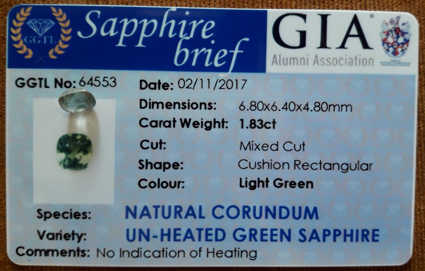 | GEMSTONE APPRAISAL / EVALUATION: | This unheated Green-Blue Sapphire, certified by a reputable GIA Alumni Laboratory, has a fair market value appraisal of approximately USD 900 to USD 1,200. Its premium handcrafted cushion cut, strong saturation, and eye-clean clarity further enhance its desirability, making it a compelling choice for collectors and enthusiasts. Considering its characteristics, this Sri Lankan Sapphire can be seen as a potential asset for the future. The 1.83 carat size, coupled with its unique yellowish green color and high-quality cut, makes it appealing in a niche market. However, it may not appreciate significantly like larger or more traditionally valued gemstones. Instead of viewing it solely as an investment, it would fit well as a personal jewelry piece or a collectible that could hold sentimental value, particularly for those who appreciate unique and unheated stones. |