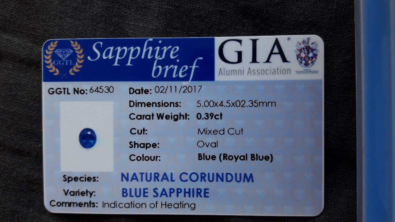 | GEMSTONE APPRAISAL / EVALUATION: | The fair market value appraisal for this vivid Royal Blue Sapphire, considering its premium handcrafted oval cut, strong saturation, and eye-clean clarity, is estimated to be in the range of USD 150 to USD 250. Its certification from a GIA Alumni Laboratory adds to its credibility, enhancing its value in the market. This Sri Lanka Ceylon Sapphire, with its 0.39 carat size, exquisite blue color, and premium cut, is not the ideal candidate for significant investment potential due to its smaller size. Instead, it would fit well in a collection of unique gemstones for personal enjoyment or as an elegant piece of jewelry rather than a financial asset. Its beauty and rarity can make it a delightful choice for a special occasion or as a meaningful gift. |