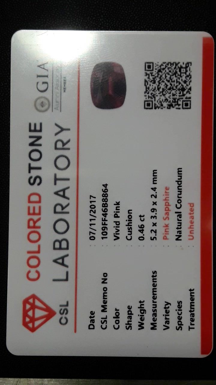 | GEMSTONE APPRAISAL / EVALUATION: | The estimated Fair Market Value for this vivid pink Sapphire, given its premium cut, eye-clean clarity, strong saturation, and unheated status from a reputable origin like Sri Lanka, falls within the range of approximately USD 800 to USD 1,200. This appraisal reflects the high quality of the stone as certified by the CSL/GIA Gem Laboratory and considers current market trends for gemstones of comparable quality. While this Sri Lankan Ceylon Sapphire may not represent a high-value investment due to its smaller carat size of 0.46, its exceptional color and craftsmanship make it an excellent choice for personal adornment or as a piece of fine jewelry. Buyers may consider this gemstone more fitting for enhancing a jewelry collection or as a unique heirloom gift, rather than viewing it solely as an investment asset. |